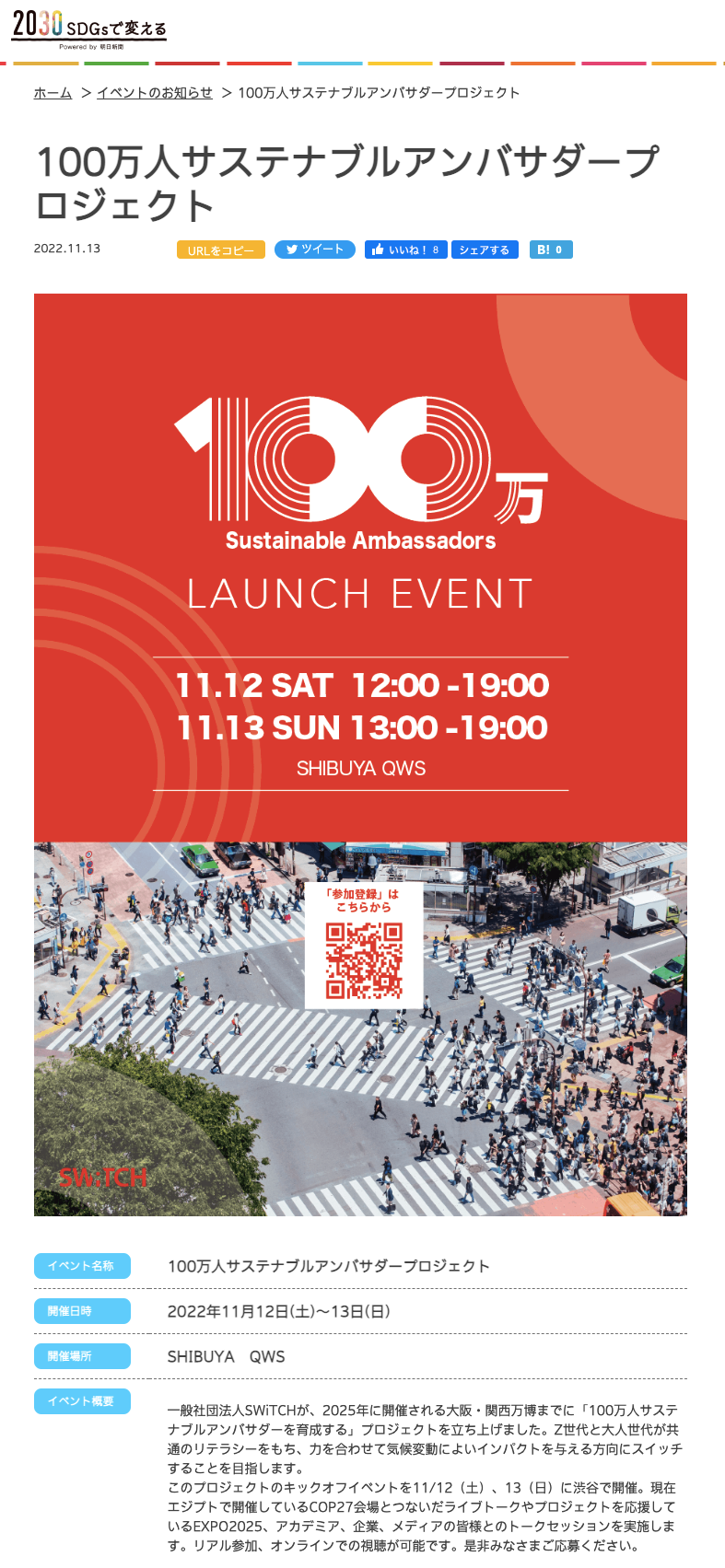 朝日新聞がSDGsの最新事情や国内外の取り組みについて発信するwebサイト「2030 SDGsで変える Produced by 朝日新聞」に、11月12、13日に開催されたSWiTCH主催『100万人サステナブルアンバサダーローンチイベント』の告知が掲載されました。(※本イベントは終了しています)