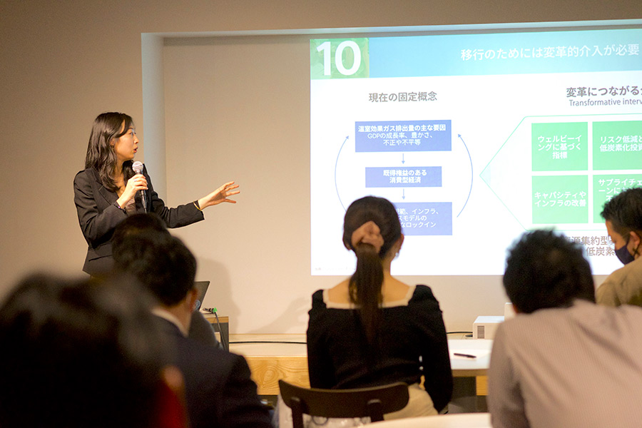 これまで同様に一般社団法人SWiTCHの代表理事・佐座槙苗をファシリテーターに「渋谷の現状」「世界の潮流」「ゴールを実現するためのアクション」の3つのアジェンダで進行。回を重ねるごとに参加者が増え、また1回目から毎回参加くださる方も多く見られ、少しずつではありますが渋谷の街にサステナブルの輪が広がっていることを実感する第3回となりました。