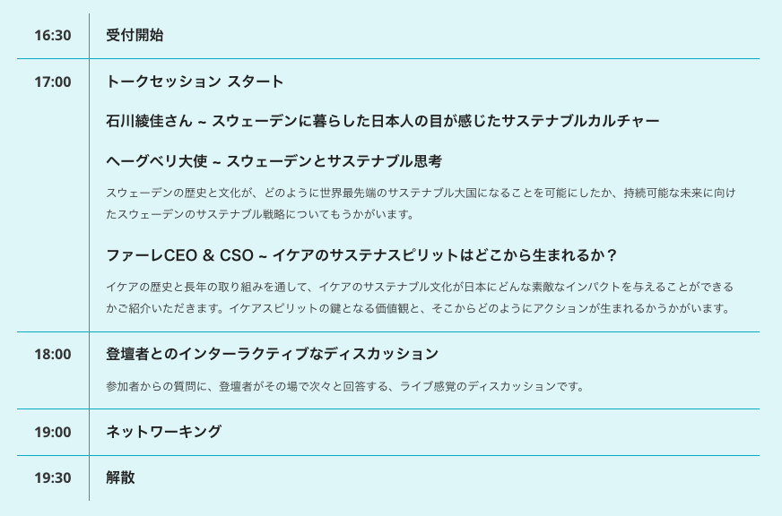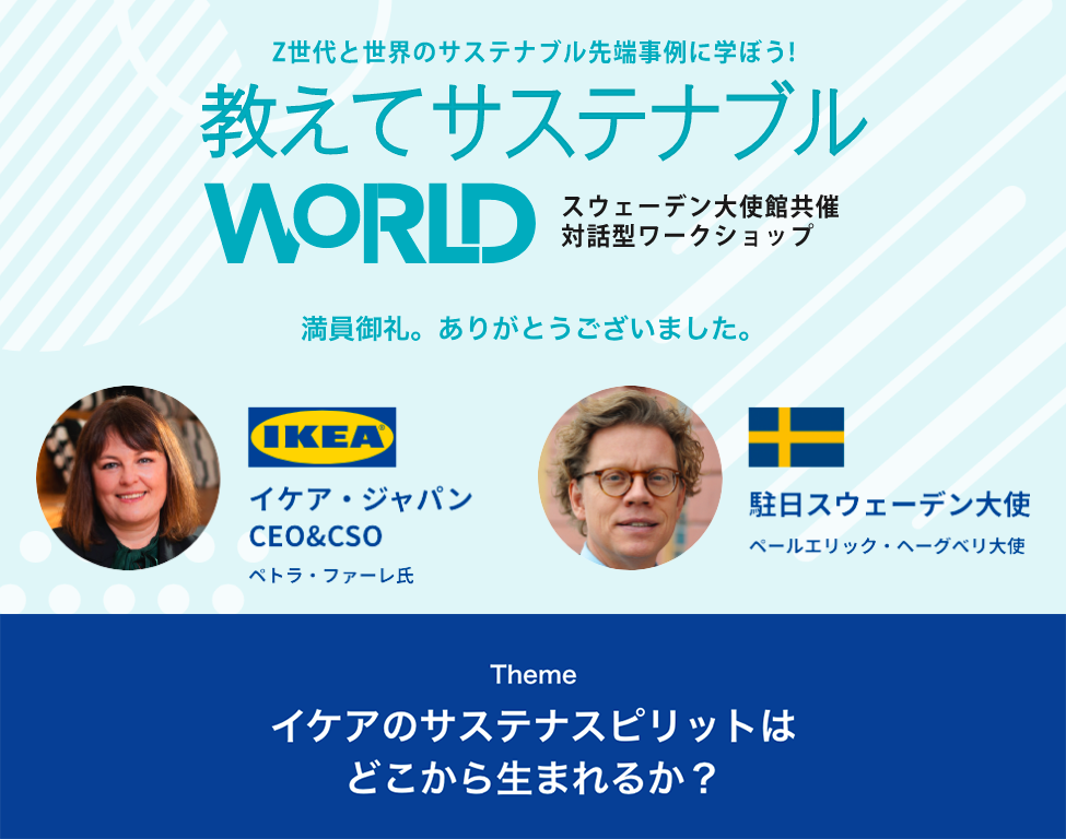 前半は、スウェーデンに留学した石川さんの体験談と、ヘーグべリ大使とペトラCEO&CSOのプレゼンテーションを通して、スウェーデンのサステナブルな取り組みを学びました。
