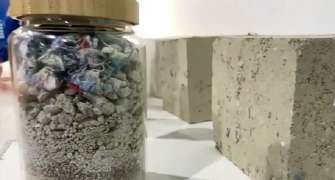 循環型建設の模型による資源循環の取り組みや、CN素材で木材部位を柱に活用する試み、粘土や布、パルプ入りの再利用コンクリートなどの環境配慮型デザインなど、様々な建築技術や素材を展示していました。