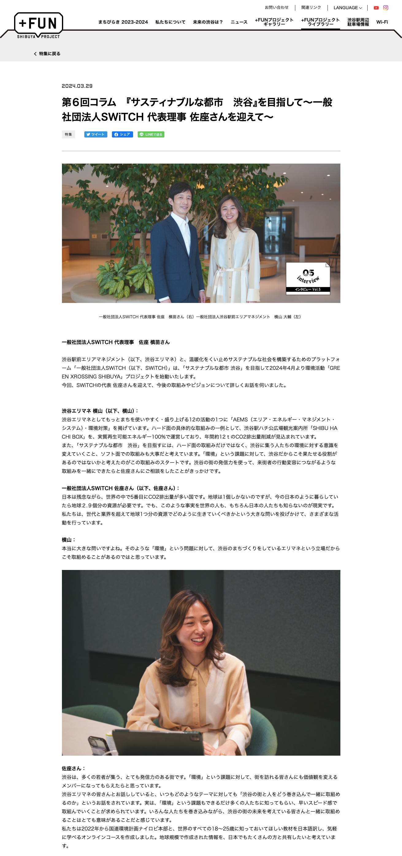 「SHIBUYA +FUN  PROJECT」サイトに、一般社団法人渋谷駅前エリアマネジメント 横山 大輔さんと一般社団法人SWiTCH 代表理事 佐座マナが対談を行った、第6回コラム「『サスティナブルな都市 渋谷』を目指して〜一般社団法人SWiTCH 代表理事 佐座さんを迎えて〜」が掲載されました。