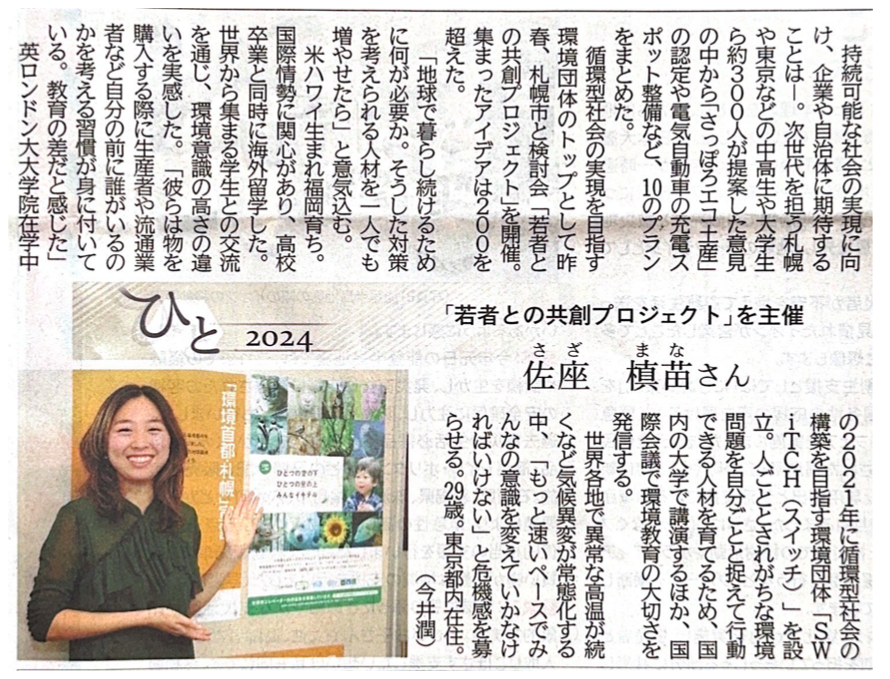 9月1日の北海道新聞「ひと」コーナーに佐座マナが掲載されました。