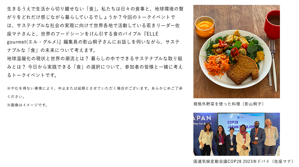 「What’s Living Design? Vol.9 佐座マナ×『ELLE gourmet』編集長 トークイベント食から始めるサステナブルで豊かな暮らし」にSWiTCH代表 佐座マナが登壇します。